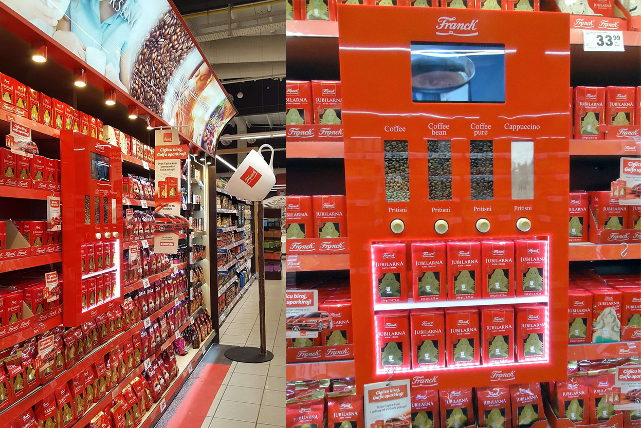 'In-store aroma marketing' za povečanje prodaje, aroma marketing za razlikovanje od konkurence. Kako oblikovati promocijsko strategijo, da kupci produkt opazijo med vsaj desetimi konkurenčnimi znamkami? Ker se 70 odstotkov nakupovalnih odločitev sprejme v trgovini in ko potrošniki stopijo med police, potrebujejo 4-8 sekund, da sprejmejo odločitev o nakupu, smo za Franck kavo odišavili prodajno mesto. Ali veste, kako diši kava po fazah obdelave? Naš naročnik Franck kava je na svoja prodajna mesta namestil vonj. Pripravili smo idejno zasnovo komunikacije na prodajnem mestu in odišavili prodajne police. Odkrijte vonj sveže nabrane kave, pražene kave in kapučina.